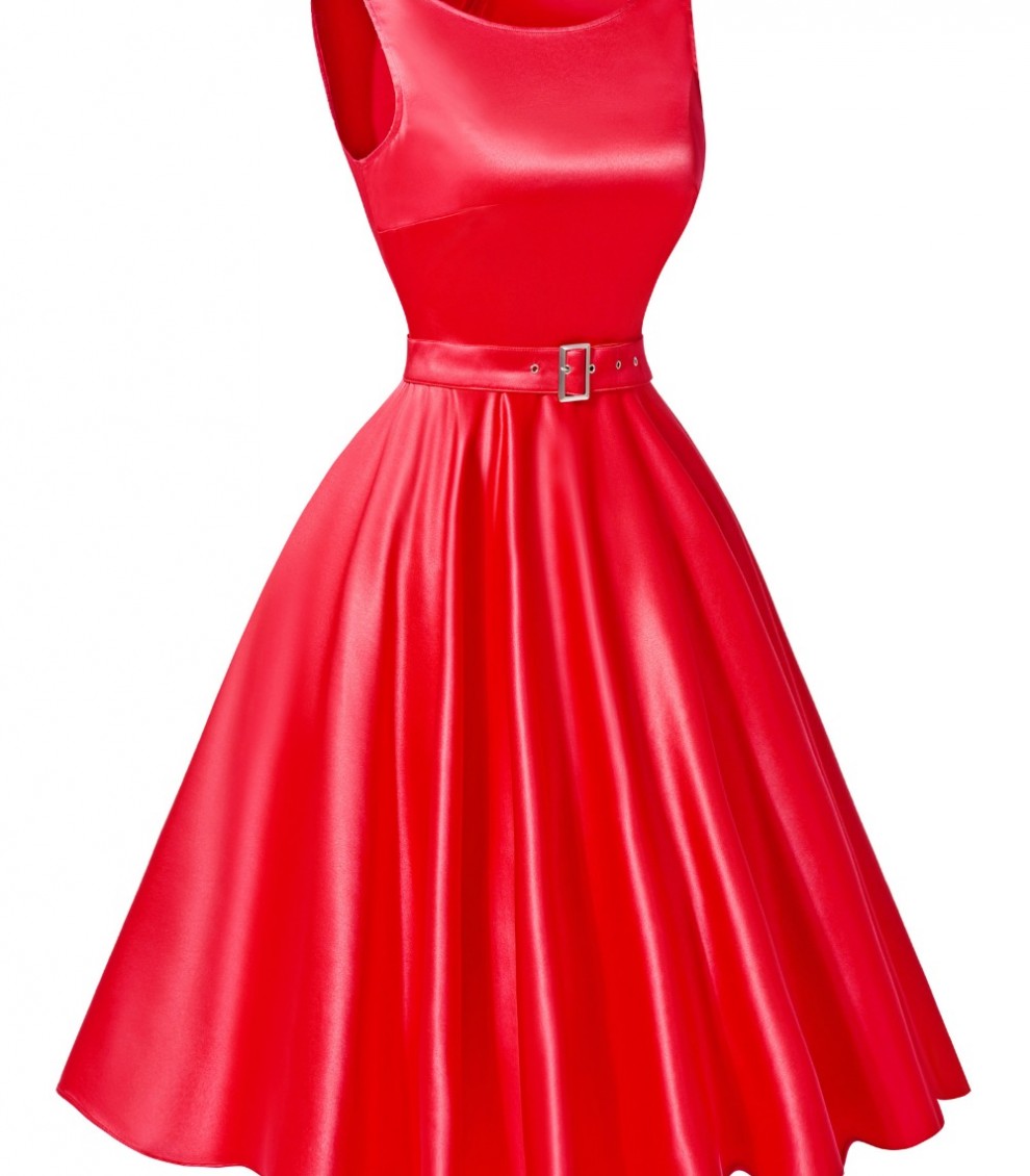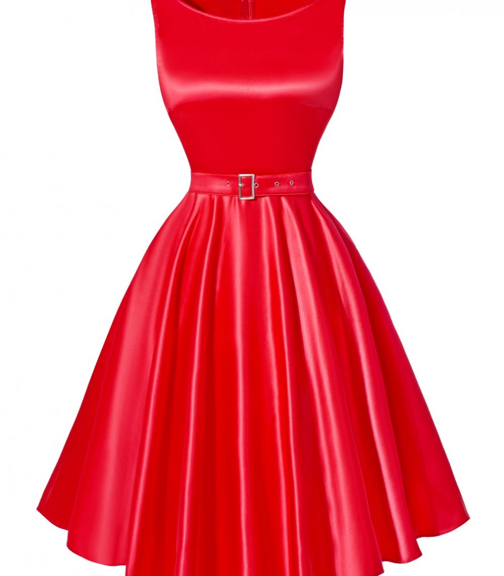 1)Sleeveless 2)Crew Neck 3)Concealed zipper at back 4)Comes with matched removable belt as pictures show |